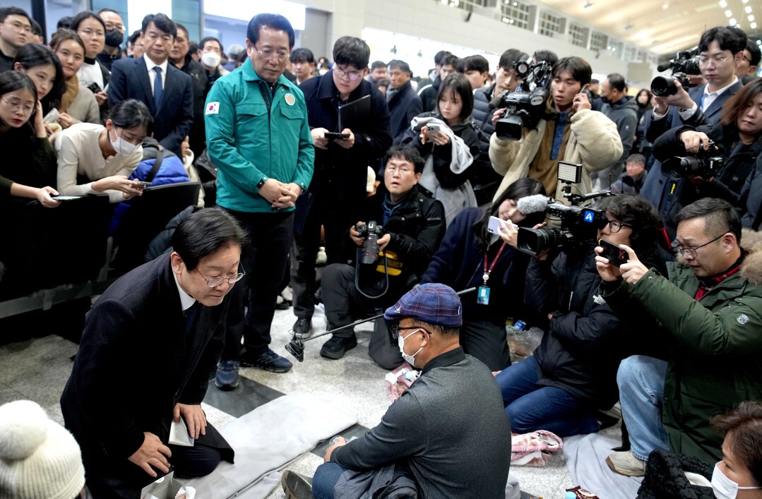 | ▲ 이재명 더불어민주당 대표가 29일 오후 전남 무안군 무안국제공항을 방문, 제주항공 여객기 폭발사고 탑승객 유가족들을 위로하고 있다. [전남도 제공] |