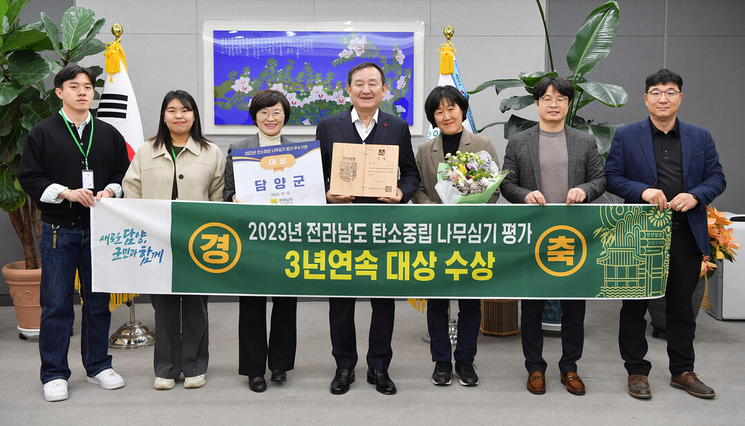 전남 담양군이 전라남도가 주관하는 2023년 탄소중립 나무심기 평가에서 3년 연속 대상을 받는 쾌거를 거뒀다.