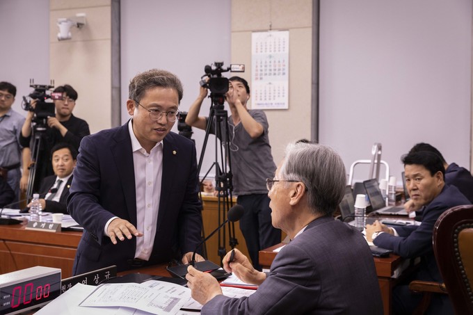 더불어민주당 김종민 의원이 6일 서울 여의도 국회에서 열린 조국 법무부장관 후보자 인사청문회에 참석, 청문회 진행방식에 관해 여상규 위원장에게 항의하고 있다.