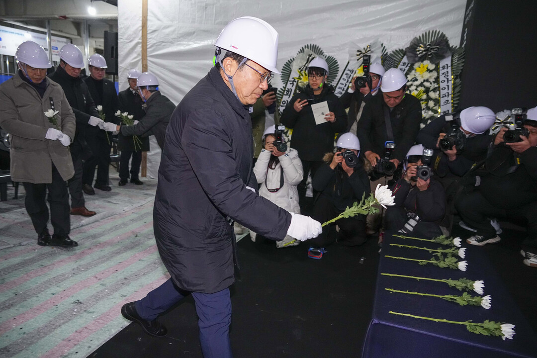 | ▲ 강기정 광주광역시장이 11일 오후 현대산업개발 신축공사 아파트 붕괴사고 3주기 추모식에 참석해 헌화 하고 있다. [광주광역시 제공] |