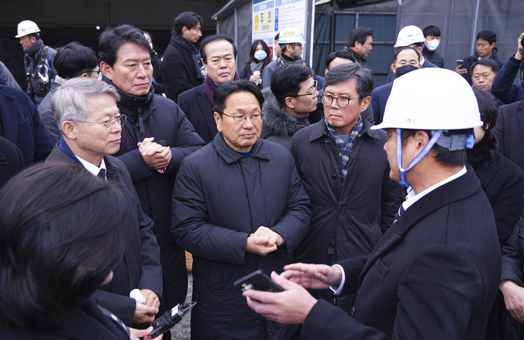 | ▲ 강기정 광주광역시장이 11일 오후 현대산업개발 신축공사 아파트 붕괴사고 3주기 추모식에 참석해 유가족 회장과 대화를 나누고 있다. [광주광역시 제공] |