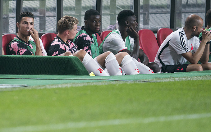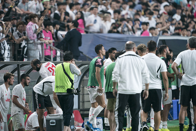 26일 오후 서울 마포구 서울월드컵경기장에서 열린 팀 K리그와 유벤투스FC의 친선경기에서 크리스티아누 호날두가 벤치에 앉아 있다. 호날두가 이날 출전하지 않은 가운데 경기는 3-3 무승부로 마무리됐다.