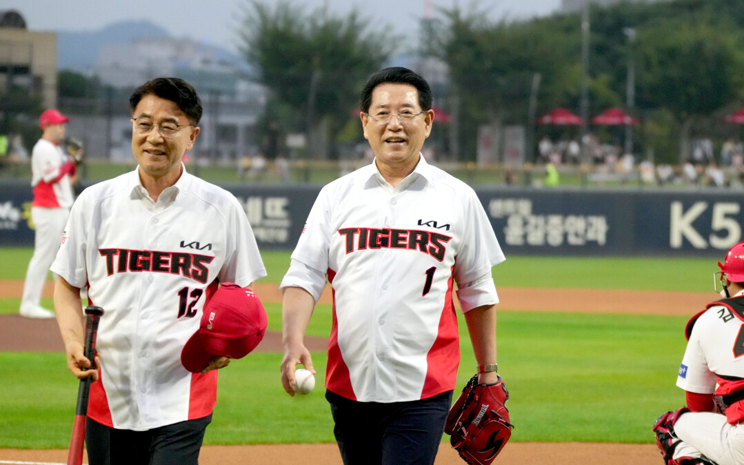 | ▲ 김영록 전라남도지사와 김태균 전남도의회 의장이 추석맞이 '남도장터' 전국 홍보를 위해 27일 오후 광주기아챔피언스필드에서 열린 2024 KBO KIA 타이거즈와 SSG 랜더스의 경기에서 시구와 시타를 한 뒤 걸어 나오고 있다. [전남도 제공] |