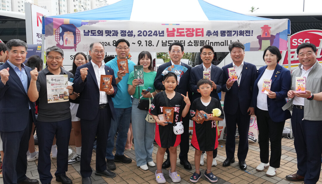 | ▲ 김영록 전라남도지사가 27일 오후 광주기아챔피언스필드 추석맞이 '남도장터' 홍보부스 앞에서 관중들에게 명절 기획전을 홍보 하고 있다. [전라남도 제공] |