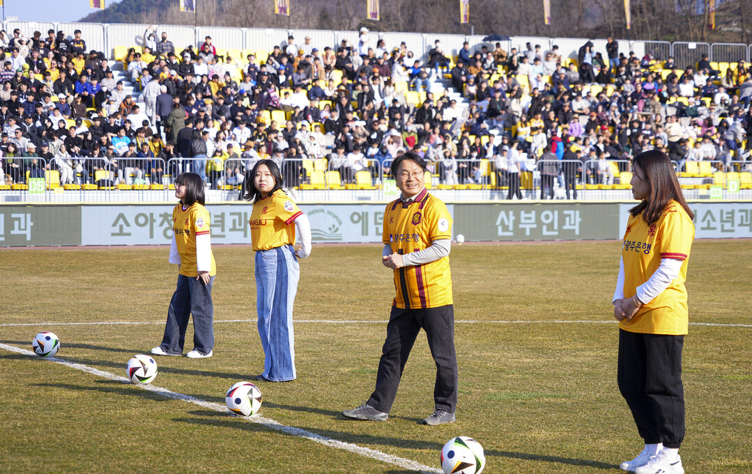 | ▲ 강기정 광주광역시장이 10일 오후 광주축구전용구장에서 열린 광주FC와 강원FC의 홈경기에 참석해 광주FC 여성서포터즈와 함께 시축하고 있다. [광주광역시 제공] |