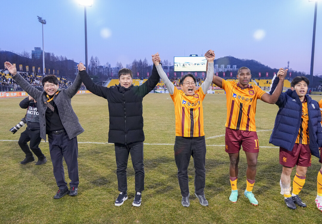 | ▲ 강기정 광주광역시장이 10일 오후 광주축구전용구장에서 열린 광주FC와 강원FC의 홈경기에 참석해 4:2로 광주 승리를 견인한 가브리엘, 이정효 감독 등과 함께 팬들에게 인사를 하고 있다. [광주광역시 제공] |
