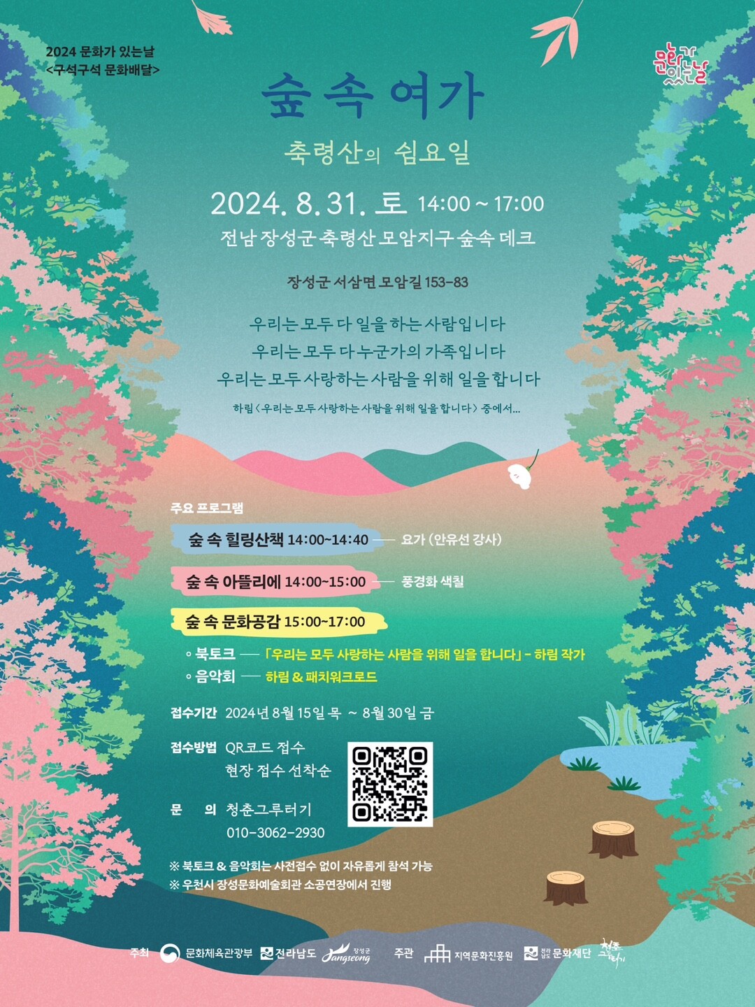 숲속여가는 '문화가 있는 날 구석구석 문화배달사업'의 일환으로, 장성 축령산 모암지구 야외무대에서 11월까지 매달 마지막 주 토요일 문화 프로그램을 연다.