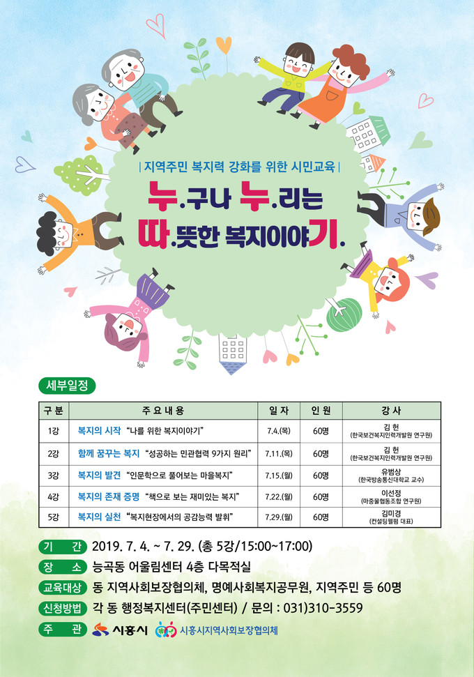 시흥시는 오는 4일부터 총 5강에 거쳐 능곡동 어울림센터 다목적실에서 지역주민 복지력 강화를 위한 시민교육 ‘누구나 누리는 따뜻한 복지이야기’를 운영한다.
