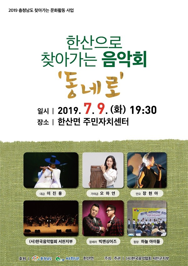사단법인 한국음악협회 서천군지부가 오는 9일 오후 7시 30분에 한산 주민자치센터에서 찾아가는 음악회 ‘동네로’를 진행한다.