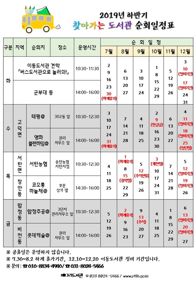 이동도서관 순회일정 및 자세한 사항은 이동도서관담당 전화 및 평택시도서관 홈페이지를 참고하면 된다.