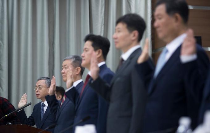 김영대 서울고등검찰청장을 비롯한 검사장들이 7일 오전 서울 서초구 서울고등검찰청에서 열린 국회 법제사법위원회 서울고등검찰청, 서울중앙지검 등 2019 국정감사에서 선서를 하고 있다.