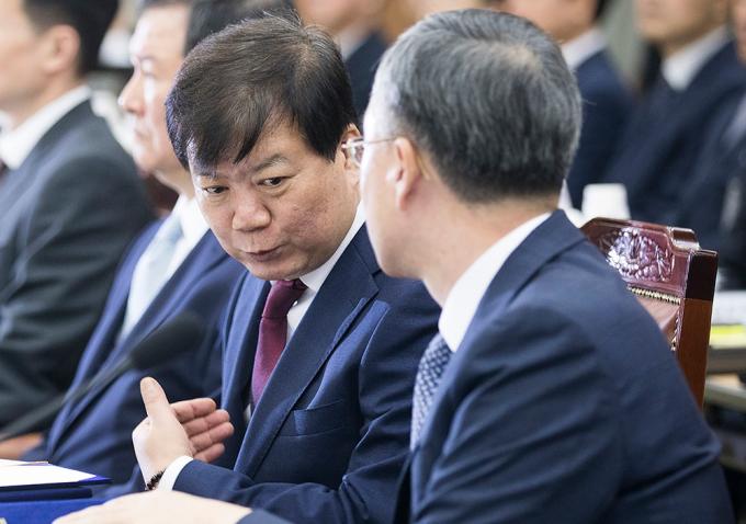 김영대(오른쪽) 서울고등검찰청장이 7일 오전 서울 서초구 서울고등검찰청에서 열린 국회 법제사법위원회 서울고등검찰청, 서울중앙지검 등 2019 국정감사에서 배성범 서울중앙지방검찰청장과 대화를 하고 있다.