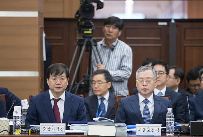 김영대(오른쪽) 서울고등검찰청장을 비롯한 검사장들이 7일 오전 서울 서초구 서울고등검찰청에서 열린 국회 법제사법위원회 서울고등검찰청, 서울중앙지검 등 2019 국정감사에 참석하고 있다.