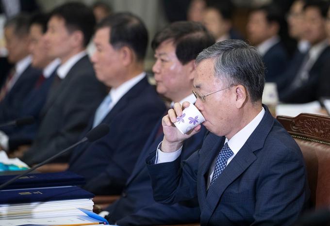 김영대 서울고등검찰청장이 7일 오전 서울 서초구 서울고등검찰청에서 열린 국회 법제사법위원회 서울고등검찰청, 서울중앙지검 등 2019 국정감사에서 물을 마시고 있다.