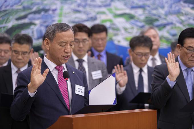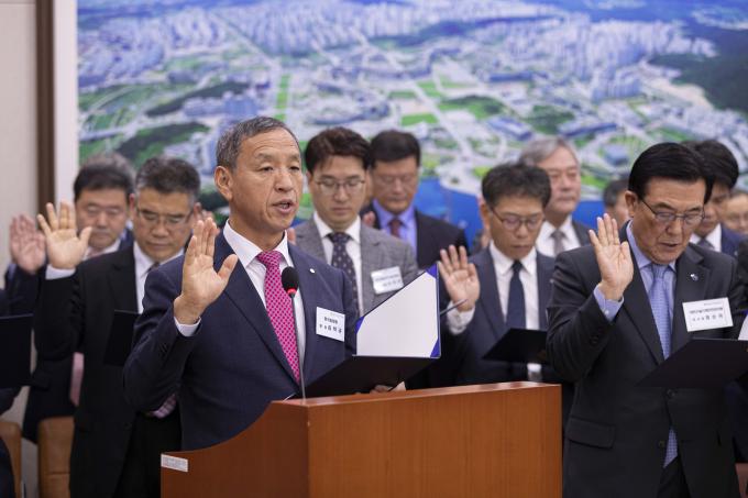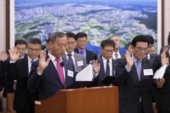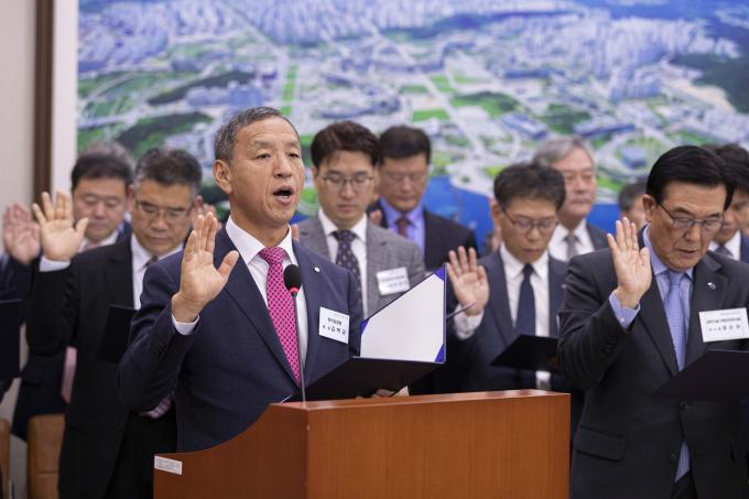 김학규 한국감정원장이 14일 오전 서울 여의도 국회에서 열린 국토교통위원회 국정감사(한국감정원, 주택도시보증공사, 한국국토정보공사 등)에 출석해 증인선서를 하고 있다.