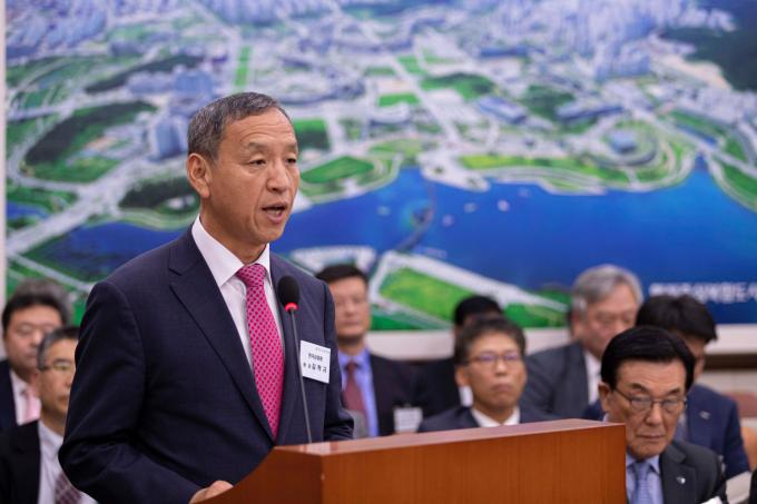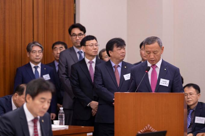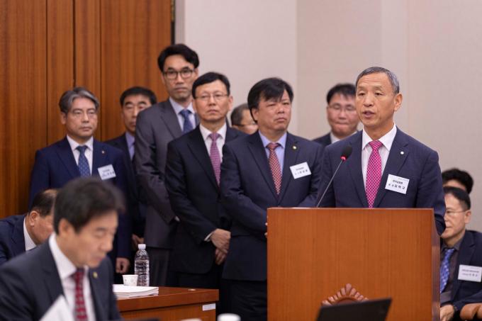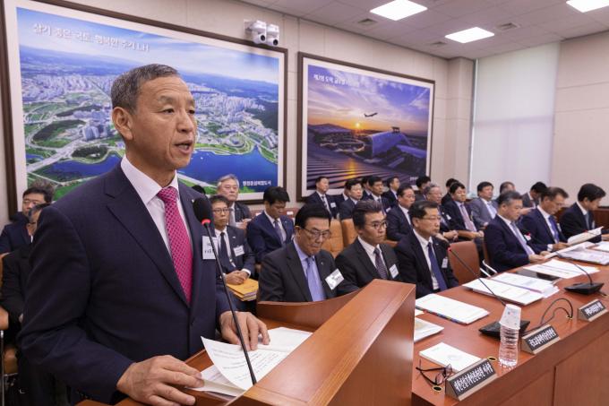 김학규 한국감정원장이 14일 오전 서울 여의도 국회에서 열린 국토교통위원회 국정감사(한국감정원, 주택도시보증공사, 한국국토정보공사 등)에 출석해 업무보고를 하고 있다.