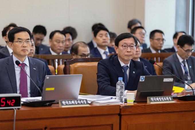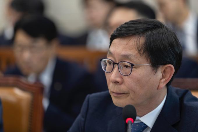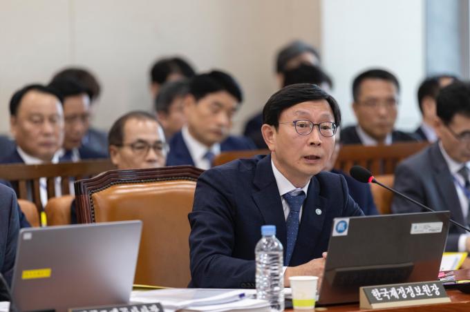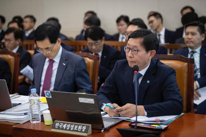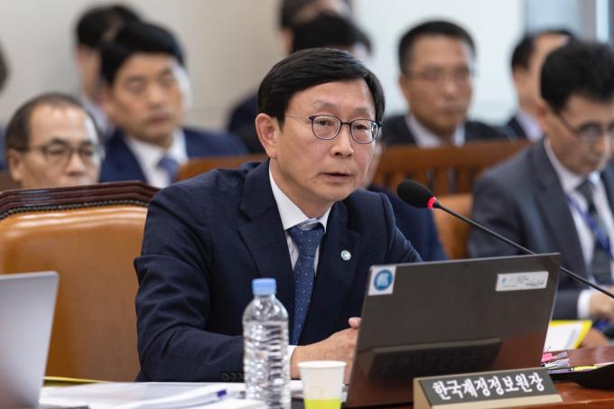 김재훈 한국재정정보원장이 14일 오후 서울 여의도 국회에서 열린 기획재정위원회 국정감사(한국수출입은행, 한국조폐공사, 한국투자공사, 한국재정정보원, 국제원산지정보원)에 출석해 의원 질의에 답하고 있다.