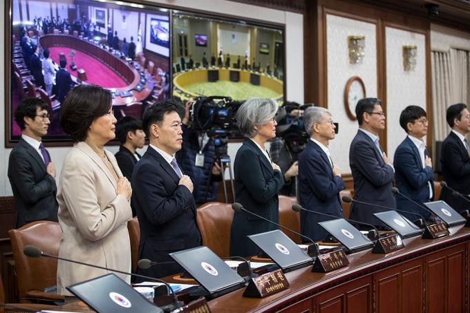 15일 오전 서울 종로구 정부서울청사에서 열린 국무회의에서 국무위원들이 국민의례를 하고 있다. 정부는 이날 국무회의에서 '검찰청 사무기구에 관한 규정' 개정안을 의결한다.
