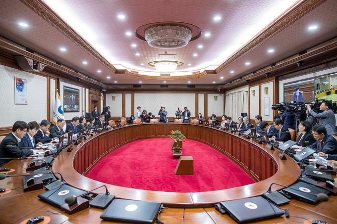 이낙연 국무총리가 15일 오전 서울 종로구 정부서울청사에서 열린 국무회의에서 의사봉을 두드리고 있다. 정부는 이날 국무회의에서 '검찰청 사무기구에 관한 규정' 개정안을 의결한다.