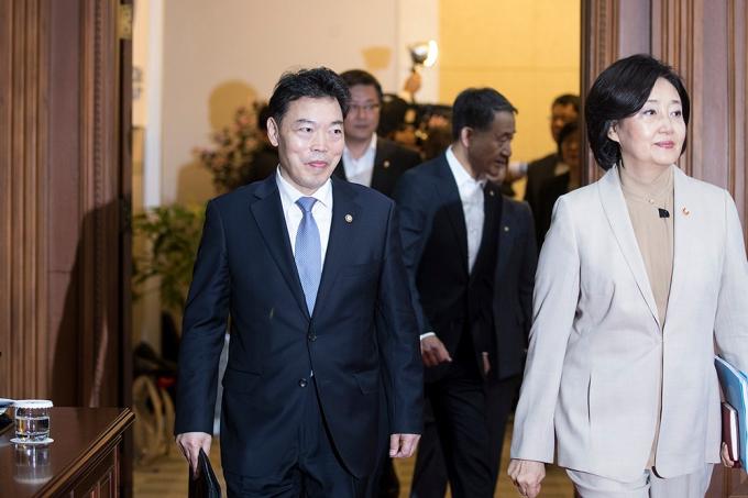 김오수 법무부 차관이 15일 오전 서울 종로구 정부서울청사에서 열린 국무회의에서 강경화 외교부 장관과 대화를 하고 있다. 정부는 이날 국무회의에서 '검찰청 사무기구에 관한 규정' 개정안을 의결한다.