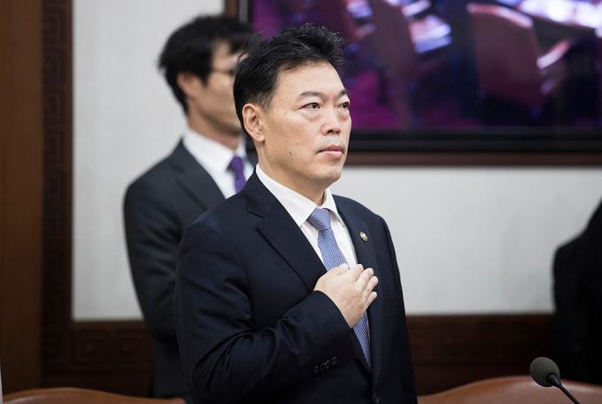 김오수 법무부 차관이 15일 오전 서울 종로구 정부서울청사에서 열린 국무회의에서 국민의례를 하고 있다. 정부는 이날 국무회의에서 '검찰청 사무기구에 관한 규정' 개정안을 의결한다.