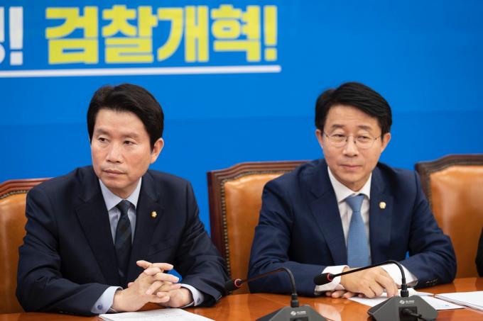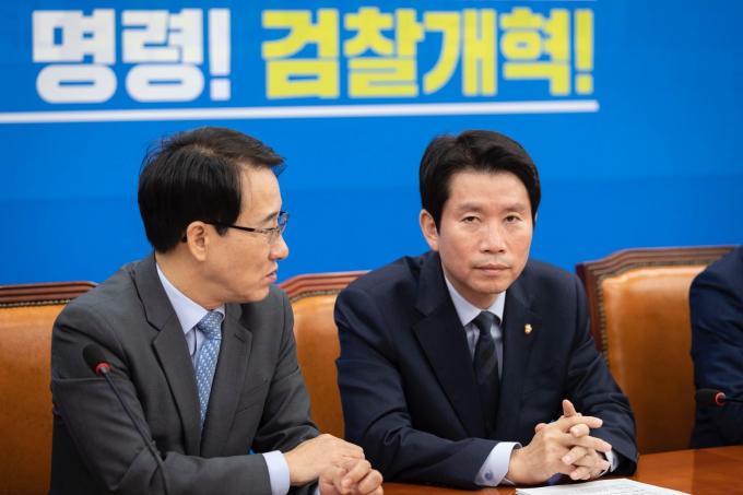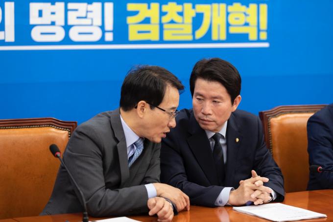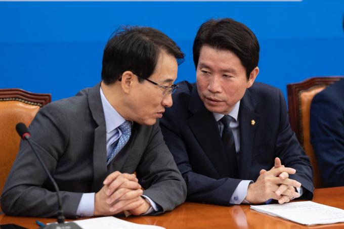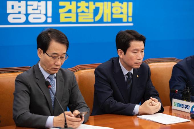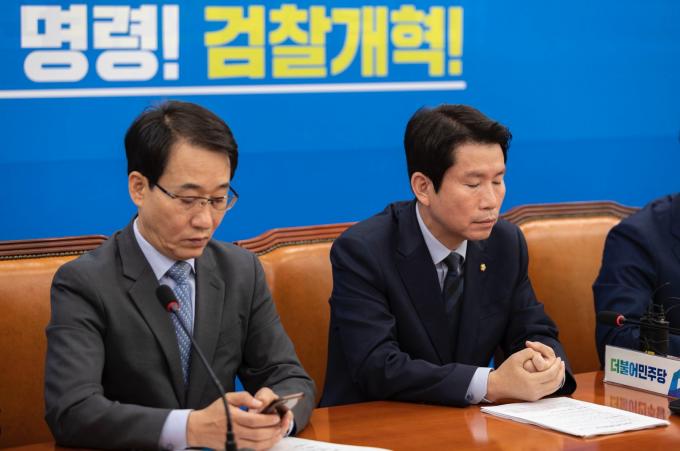 더불어민주당 이인영 원내대표(오른쪽)가 15일 오전 서울 여의도 국회에서 열린 '민주당 원내대책회의-상임위간사단 연석회의'에 참석하고 있다.