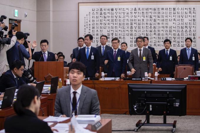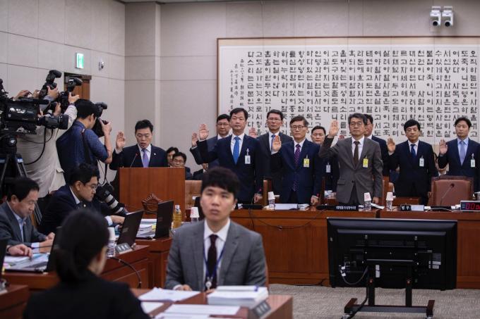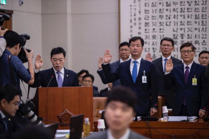 김오수 법무부 차관이 15일 오전 서울 여의도 국회에서 열린 법제사법위원회 국정감사(법무부, 대한법률구조공단, 한국법무보호복지공단, 정부법무공단 등)에 출석해 선서하고 있다. 김 차관은 전날 사퇴한 조국 전 법무부 장관을 대신해 국정감사에 참석했다.