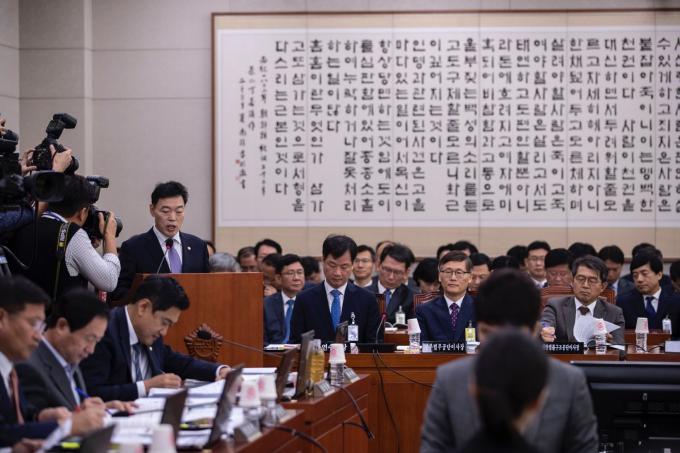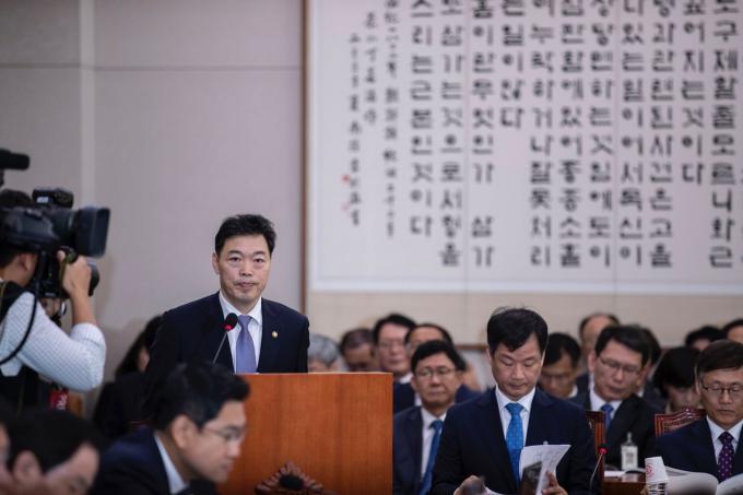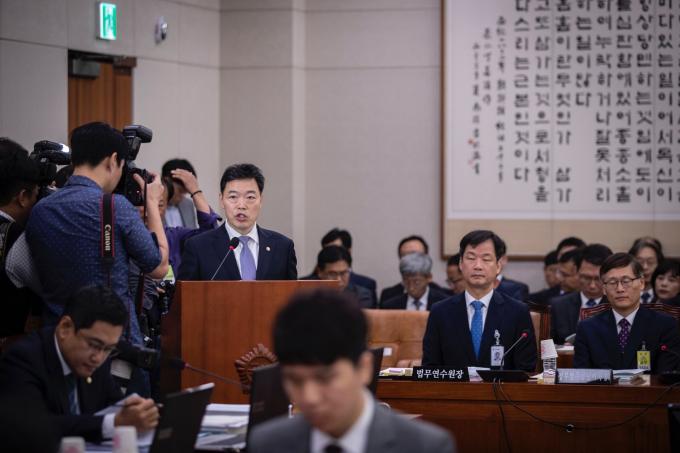 김오수 법무부 차관이 15일 오전 서울 여의도 국회에서 열린 법제사법위원회 국정감사(법무부, 대한법률구조공단, 한국법무보호복지공단, 정부법무공단 등)에 출석해 업무보고를 하고 있다. 김 차관은 전날 사퇴한 조국 전 법무부 장관을 대신해 국정감사에 참석했다.