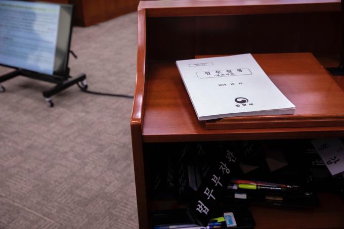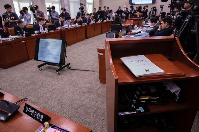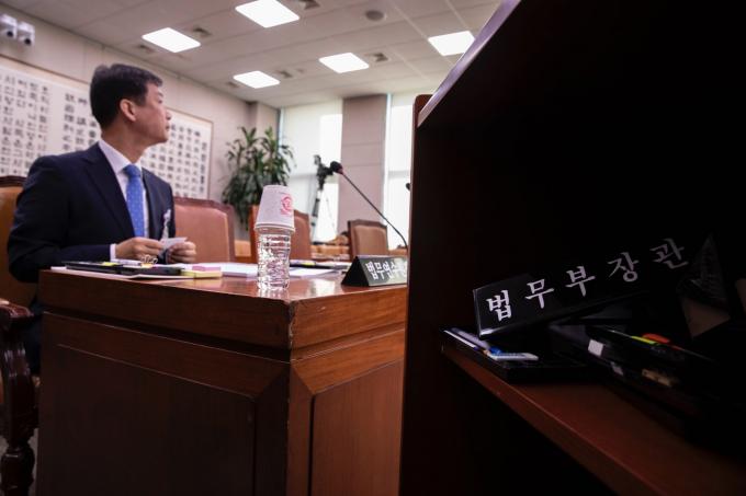 법제사법위원회 국정감사(법무부, 대한법률구조공단, 한국법무보호복지공단, 정부법무공단 등)가 15일 오전 서울 여의도 국회에서 열린 가운데 법무부 장관 명패가 단상 아래에 놓여 있다.