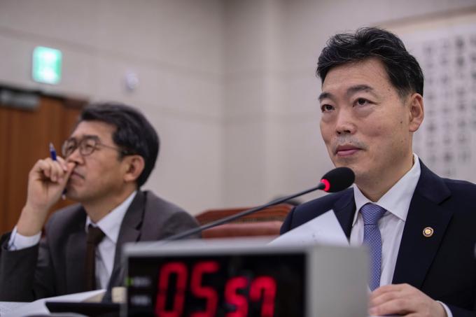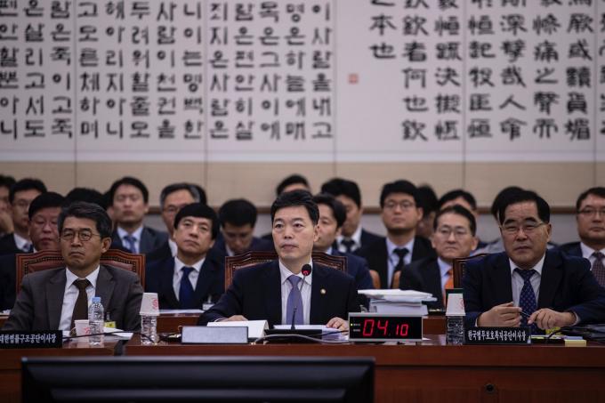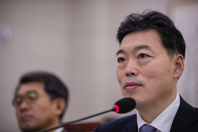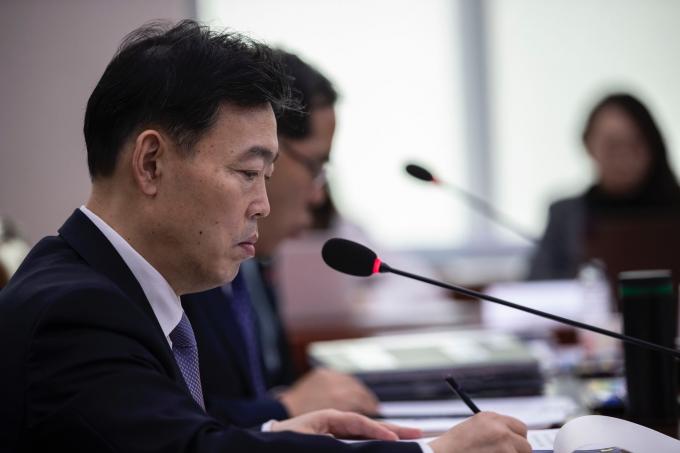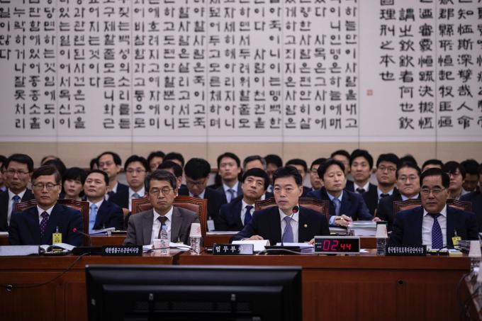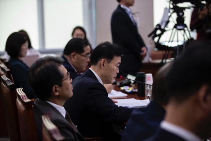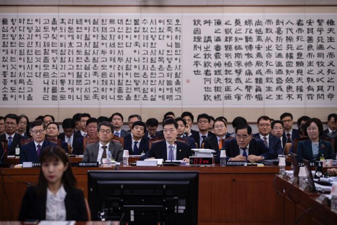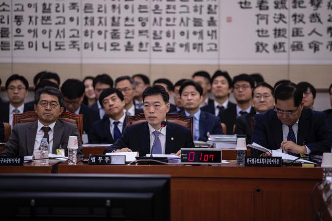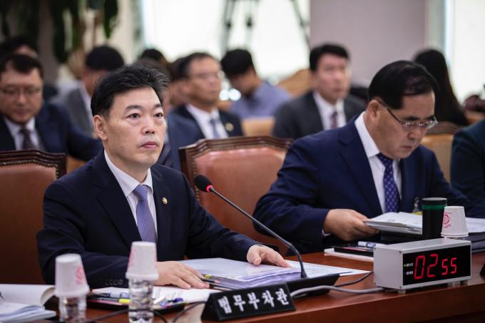 김오수 법무부 차관이 15일 오전 서울 여의도 국회에서 열린 법제사법위원회 국정감사(법무부, 대한법률구조공단, 한국법무보호복지공단, 정부법무공단 등)에 출석해 의원 질의를 듣고 있다. 김 차관은 전날 사퇴한 조국 전 법무부 장관을 대신해 국정감사에 참석했다.