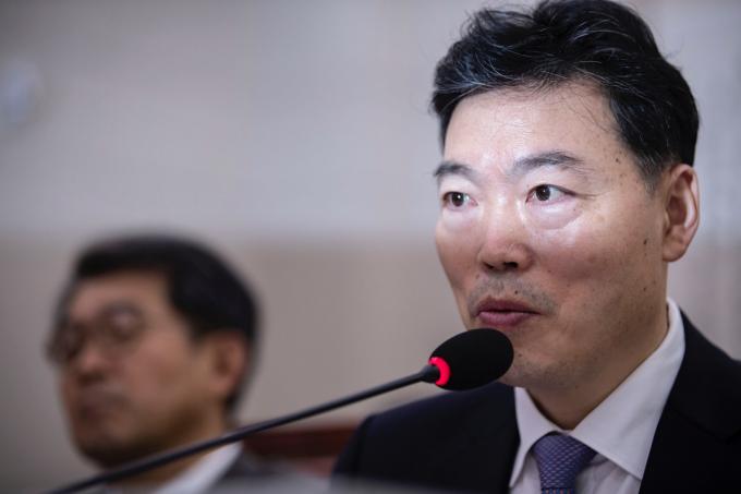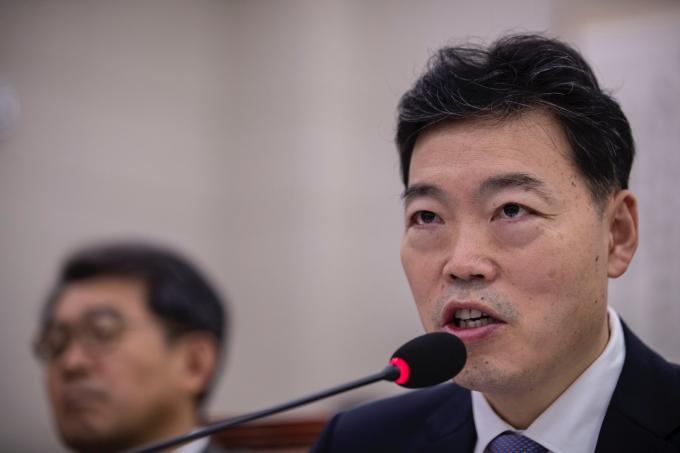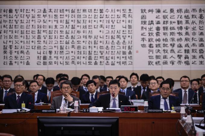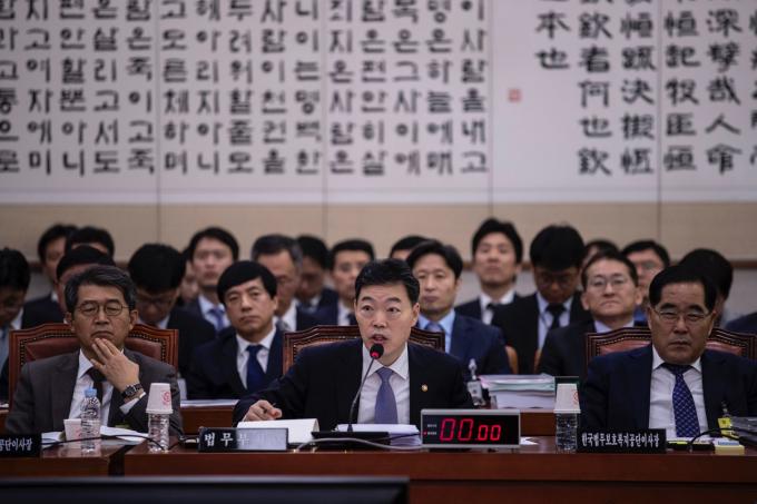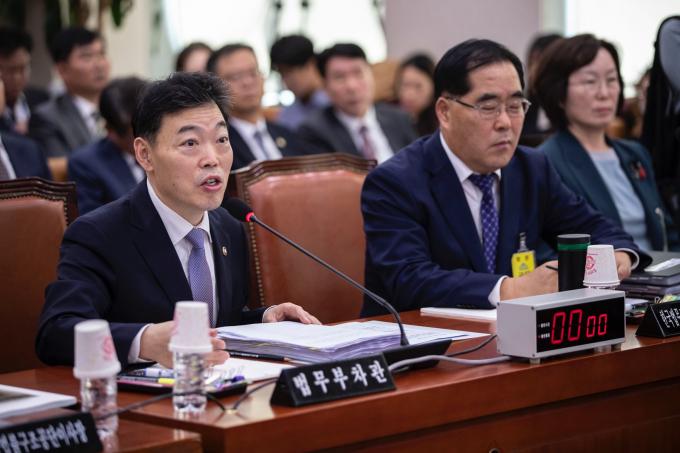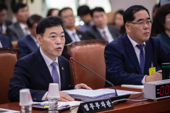김오수 법무부 차관(왼쪽)이 15일 오전 서울 여의도 국회에서 열린 법제사법위원회 국정감사(법무부, 대한법률구조공단, 한국법무보호복지공단, 정부법무공단 등)에 출석해 의원 질의에 답하고 있다. 김 차관은 전날 사퇴한 조국 전 법무부 장관을 대신해 국정감사에 참석했다.