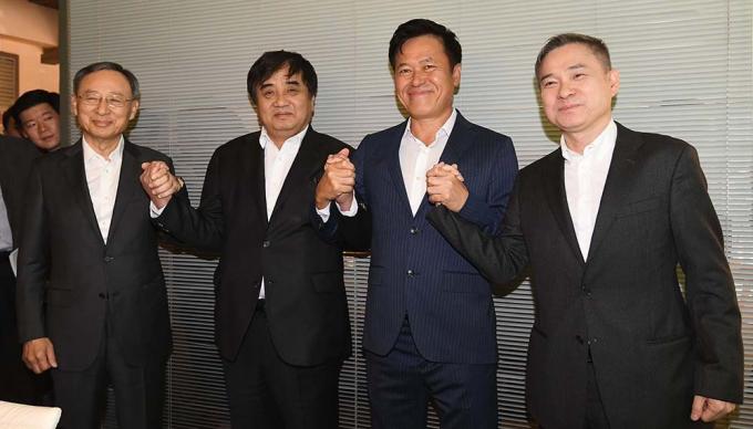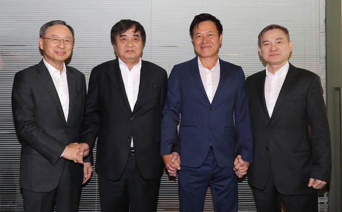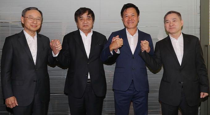 한상혁 방송통신위원장(왼쪽 두번째)이 15일 서울 중구 한 음식점에서 황창규 KT 회장, 박정호 SK텔레콤 사장, 하현회 LG유플러스 부회장(왼쪽부터) 등 이동통신3사 대표들과 오찬에 앞서 기념촬영 하고 있다.