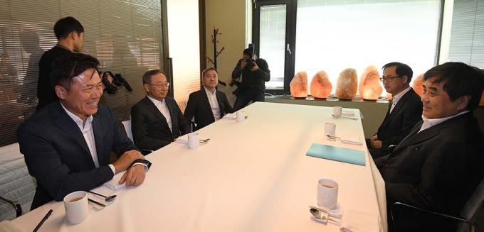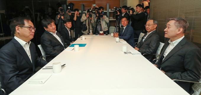 한상혁 방송통신위원장이 15일 서울 중구 한 음식점에서 박정호 SK텔레콤 사장, 황창규 KT 회장, 하현회 LG유플러스 부회장 등 이동통신3사 대표들과 오찬에 앞서 대화를 하고 있다.