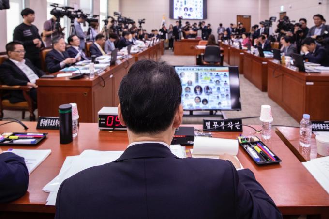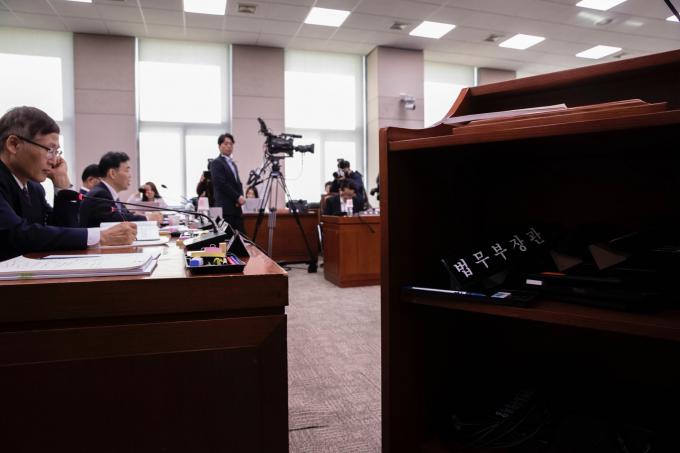 조국 법무부 장관 사퇴로 직무대행을 맡은 김오수 법무부 차관이 15일 오전 서울 여의도 국회에서 열린 법제사법위원회 국정감사(법무부, 대한법률구조공단, 한국법무보호복지공단, 정부법무공단 등)에 출석해 의원 질의에 답하고 있다. 오른쪽 단상 아래에 법무부 장관 명패가 놓여 있다. 김 차관은 전날 사퇴한 조국 전 법무부 장관을 대신해 국정감사에 참석했다.