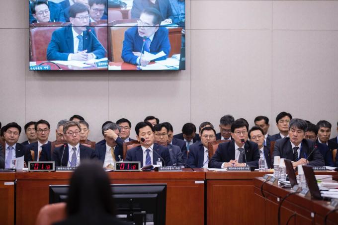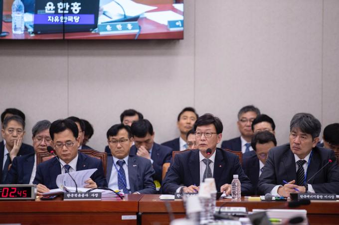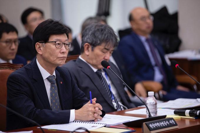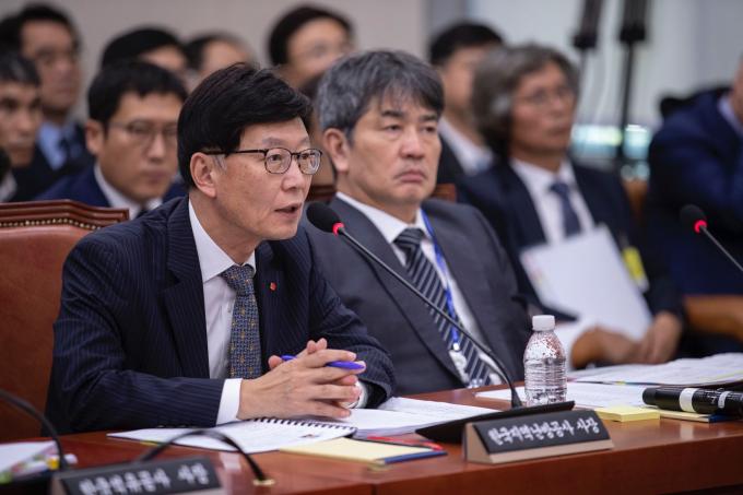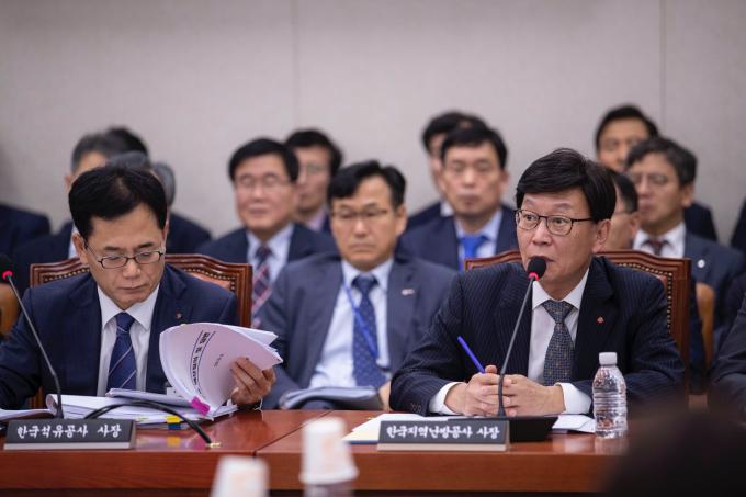 황창화(오른쪽) 한국지역난방공사 사장이 15일 오후 서울 여의도 국회에서 열린 산업통상자원중소벤처기업위원회 국정감사(한국가스공사, 한국석유공사, 한국광물자원공사, 대한석탄공사, 한국광해관리공단, 강원랜드, 한국석유관리원, 한국가스기술공사, 한국에너지공단, 한국에너지재단, 한국지역난방공사, 한국전기안전공사, 한국가스안전공사)에 출석해 의원 질의에 답하고 있다.