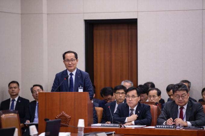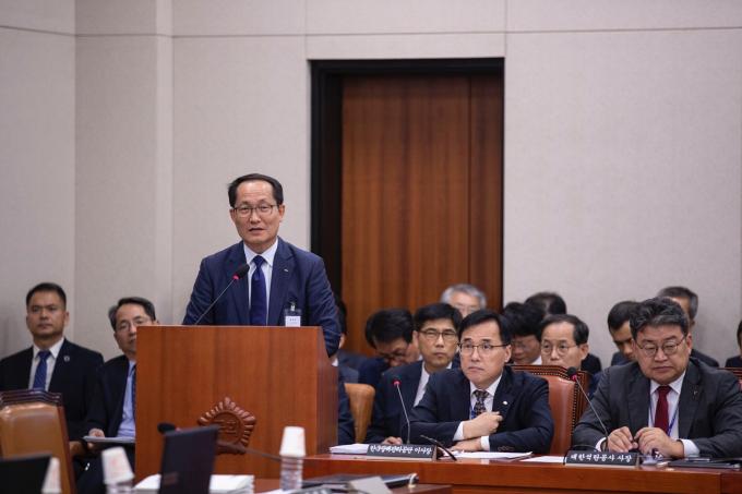 조성완 한국전기안전공사 사장이 15일 오후 서울 여의도 국회에서 열린 산업통상자원중소벤처기업위원회 국정감사(한국가스공사, 한국석유공사, 한국광물자원공사, 대한석탄공사, 한국광해관리공단, 강원랜드, 한국석유관리원, 한국가스기술공사, 한국에너지공단, 한국에너지재단, 한국지역난방공사, 한국전기안전공사, 한국가스안전공사)에 출석해 의원 질의에 답하고 있다.