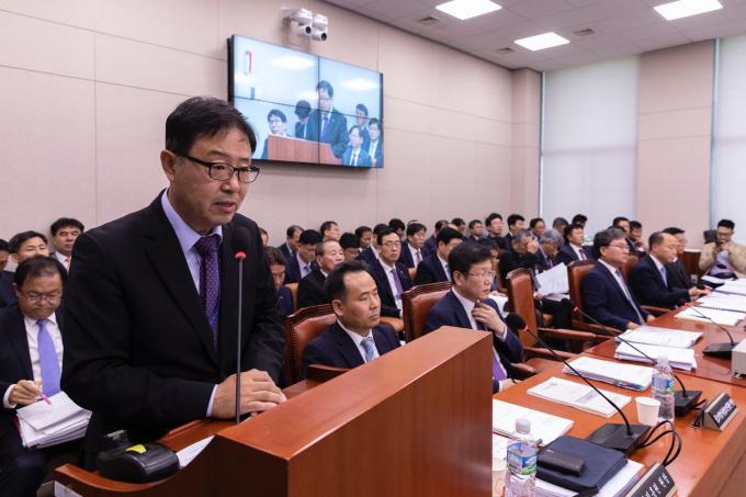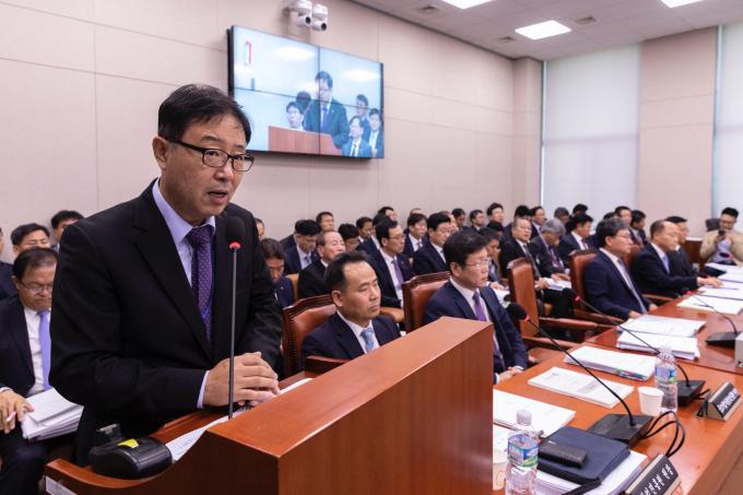 정윤모 기술보증기금 이사장이 16일 오전 서울 여의도 국회에서 열린 산업통상자원중소벤처기업위원회의 중소벤처기업진흥공단, 기술보증기금, 소상공인시장진흥공단, 중소기업기술정보진흥원 등에 대한 국정감사에 출석해 업무보고를 하고 있다.