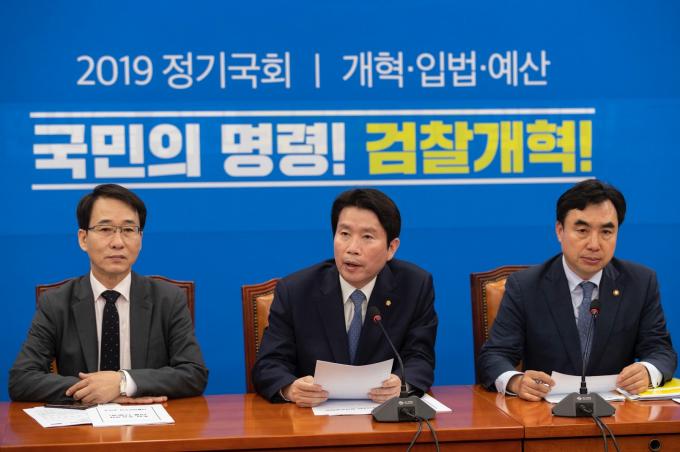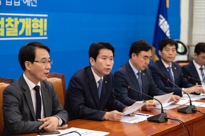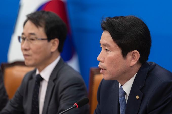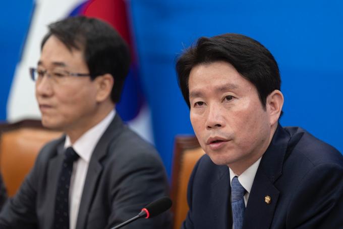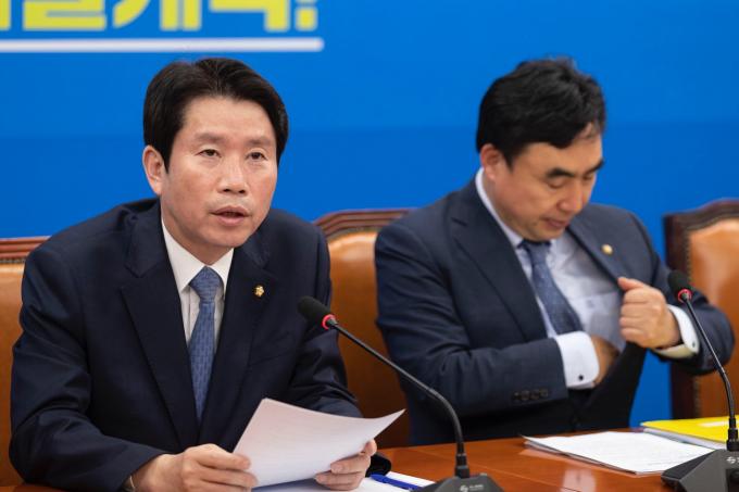 더불어민주당 이인영 원내대표(오른쪽)가 17일 오전 서울 여의도 국회에서 열린 민주당 정책조정회의에 참석해 발언하고 있다.