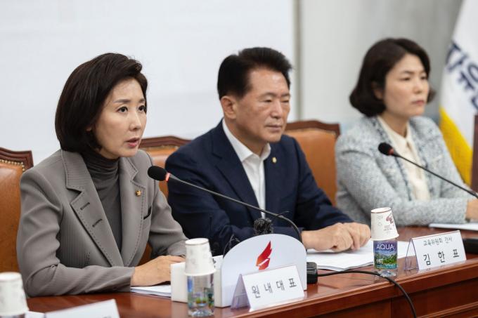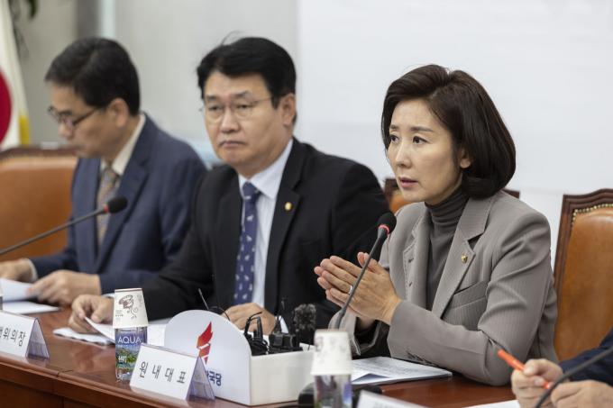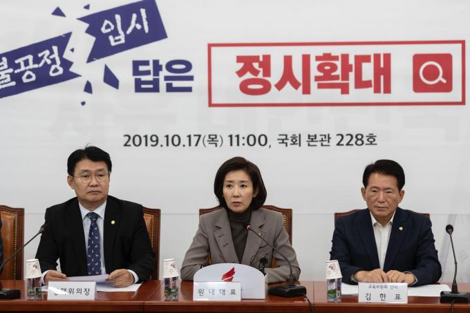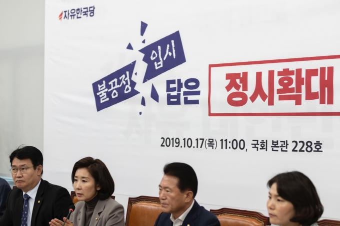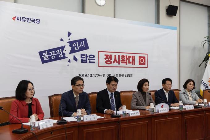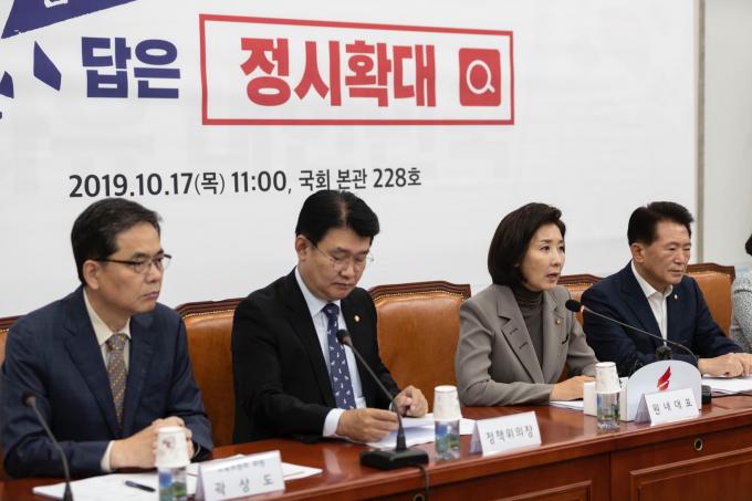 자유한국당 나경원 원내대표(왼쪽 네번째)가 17일 오전 서울 여의도 국회에서 열린 '정시확대 관련 교육위원회 간담회'에 참석해 발언하고 있다.