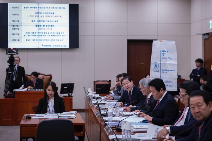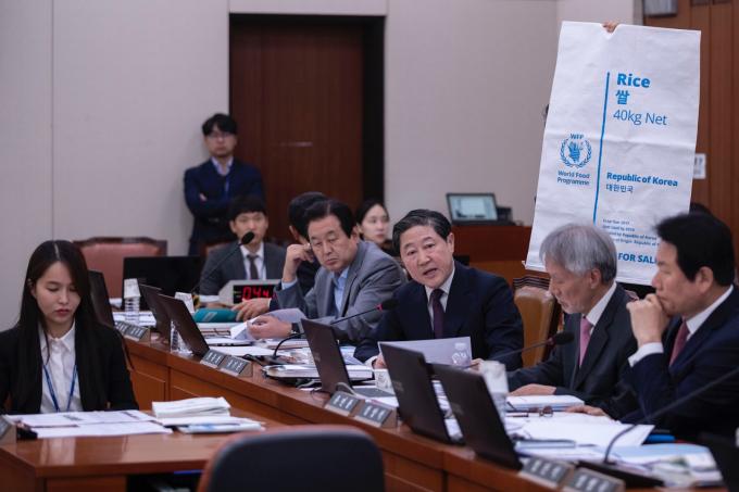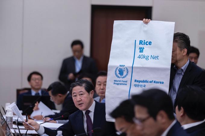 자유한국당 유기준 의원이 17일 서울 여의도 국회에서 열린 외교통일위원회 국정감사(통일부, 민주평화통일자문위원회의)에 참석, 질의 도중 통일부가 사전 제작한 대북식량지원용 쌀포대를 펼쳐 보이고 있다.