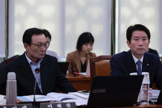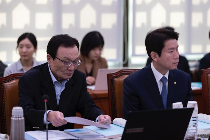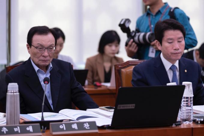 더불어민주당 이해찬 대표(왼쪽)와 이인영 원내대표가 17일 서울 여의도 국회에서 열린 외교통일위원회 국정감사(통일부, 민주평화통일자문회의 사무처)에 참석하고 있다.