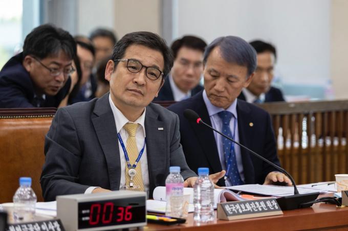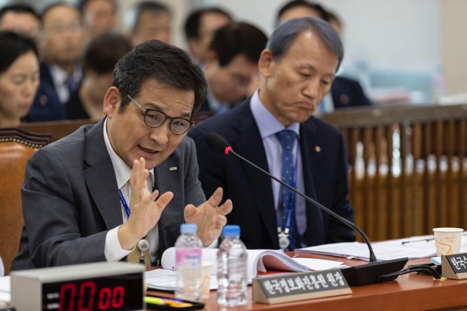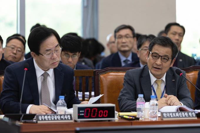 문용식 한국정보화진흥원장(오른쪽)이 17일 오후 서울 여의도 국회에서 열린 행정안전위원회 국정감사(공무원연금공단, 한국승강기안전공단 등 9개 기관)에 출석해 의원 질의에 답하고 있다.