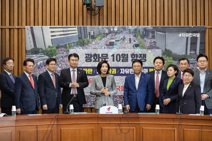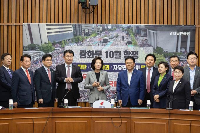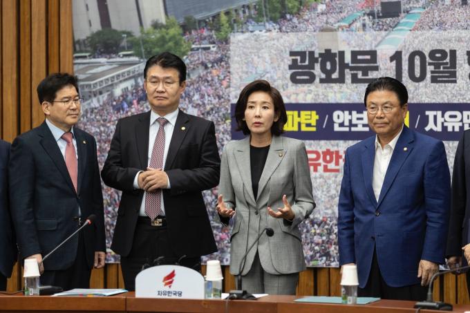 자유한국당 나경원 원내대표(왼쪽 다섯번째)가 18일 오전 서울 여의도 국회에서 열린 국정감사대책회의에 참석, 회의장에 붙은 '광화문 집회' 배경 사진 관련 발언을 하고 있다.