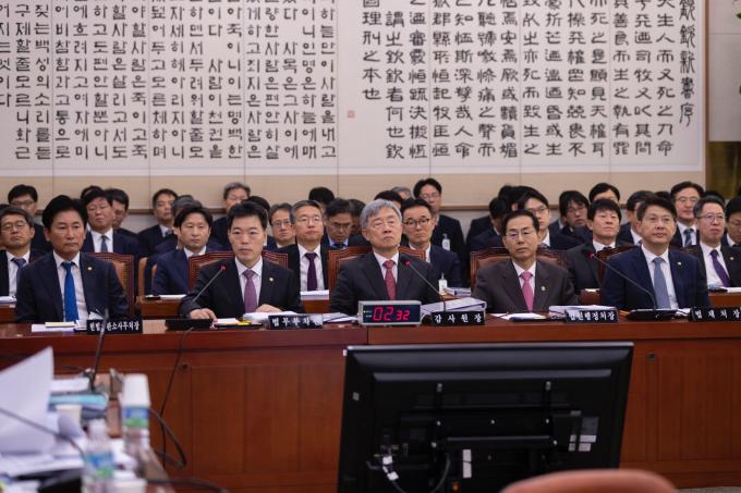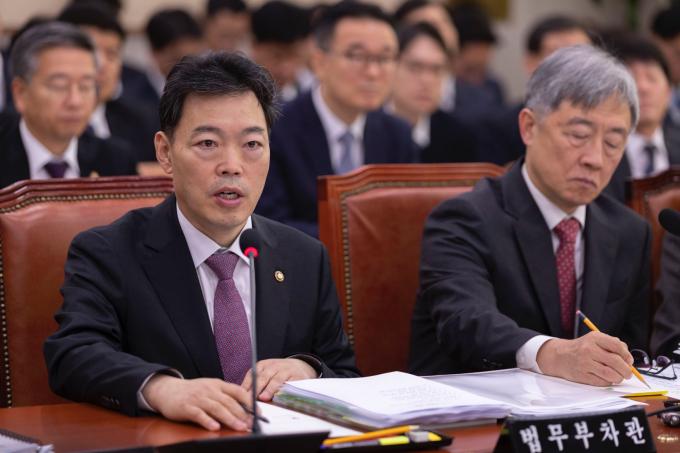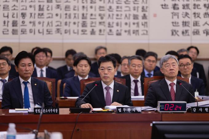 김오수 법무부 차관(가운데)이 21일 오전 서울 여의도 국회에서 열린 법제사법위원회 종합국정감사에 출석해 의원 질의를 듣고 있다.