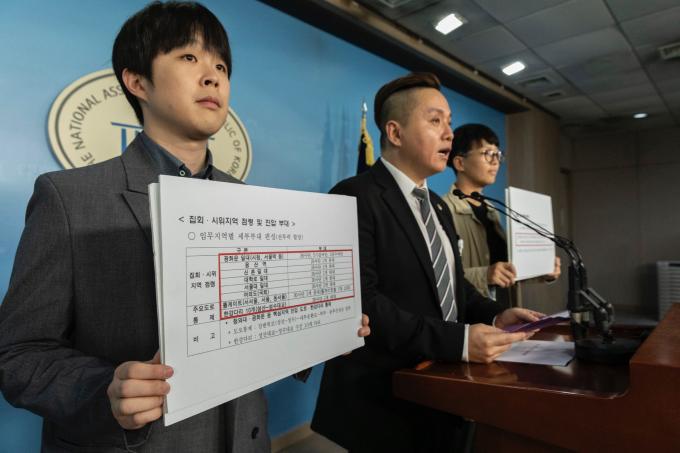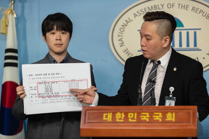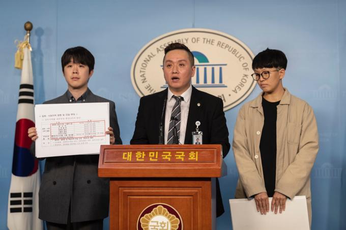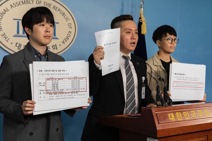 임태훈 군인권센터소장(가운데)이 21일 오후 서울 여의도 국회 정론관에서 옛 국군기무사령부의 '촛불집회 계엄령' 문건과 관련해 기자회견을 하고 있다.