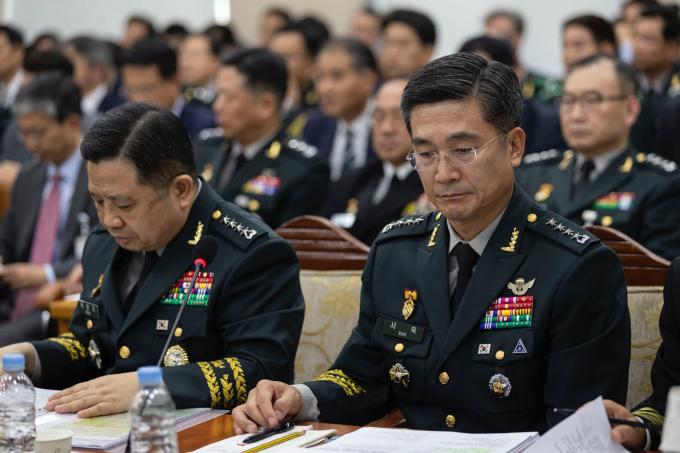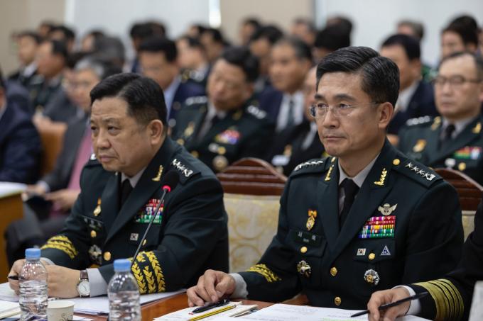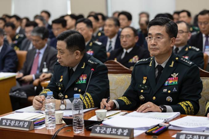 서욱 육군참모총장(오른쪽)이 21일 서울 여의도 국회 국방위원회에서 열린 국방부, 병무청, 방위사업청, 합동참모본부, 육·해·공군본부, 해병대사령부 종합국정감사에 출석해 의원 질의를 듣고 있다. 왼쪽은 박한기 합동참모의장