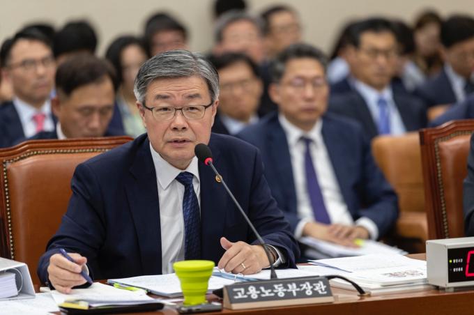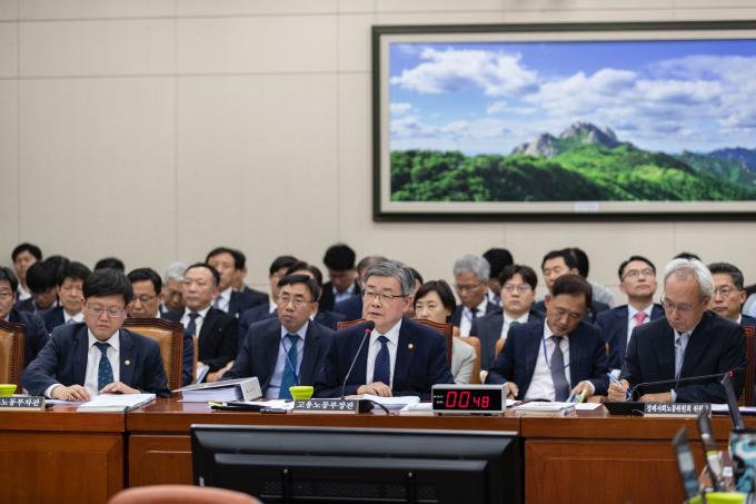 이재갑 고용노동부 장관이 21일 서울 여의도 국회에서 열린 환경노동위원회 종합국정감사에 출석해 의원 질의에 답하고 있다.