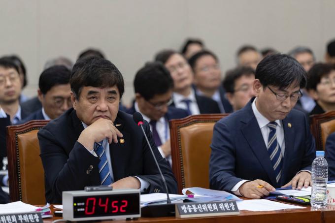 한상혁 방송통신위원회 위원장(왼쪽)이 21일 서울 여의도 국회 과학기술정보방송통신위원회에서 열린 방송통신위원회·원자력안전위원회 소관 감사 대상기관 종합국정감사에서 질의를 듣고 있다.