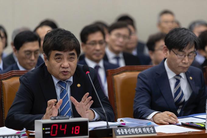 한상혁 방송통신위원회 위원장이 21일 서울 여의도 국회 과학기술정보방송통신위원회에서 열린 방송통신위원회·원자력안전위원회 소관 감사 대상기관 종합국정감사에 참석해 의원 질의에 답하고 있다.