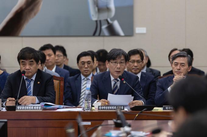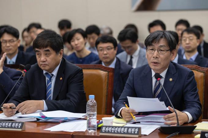 엄재식 원자력안전위원회 위원장(가운데)이 21일 서울 여의도 국회 과학기술정보방송통신위원회에서 열린 방송통신위원회·원자력안전위원회 소관 감사 대상기관 종합국정감사에서 의원 질의에 답변하고 있다.